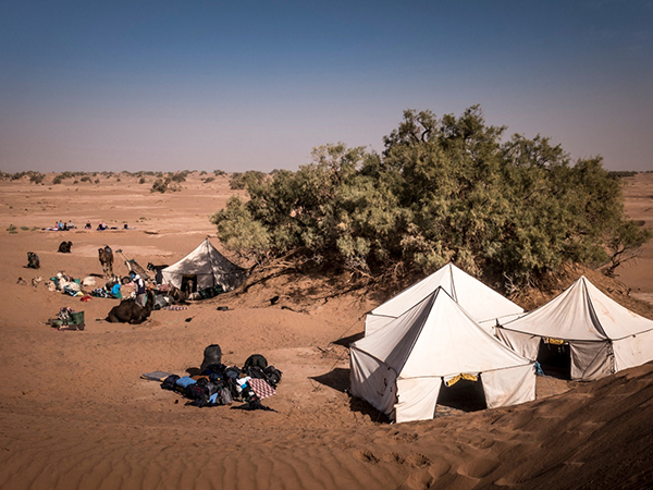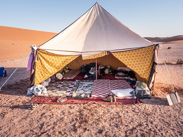 Au campement, petits matelas déposés sur un tapis de sol, recouverts de couvertures et coussins constitueront le salon/salle à manger ; ces mêmes éléments seront transportés sous la tente bédouine au moment du coucher. Eclairage à la bougie. Pas de draps ni serviettes de toilette, mais eau et papier WC fourni