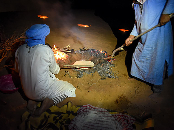 Après le petit déjeuner , départ en direction de Bougarn, avec déjeuner en route, à proximité de arg Garzim, au total 5 heures de marche (15 km environ). Après l’installation du bivouac, coucher de soleil sur les belles dunes. C’est le moment de la fabrication du pain et sa cuisson dans le sable, tout un spectacle, et surtout un régal. Soupe et tajine auront mijoté longuement au feu de bois.