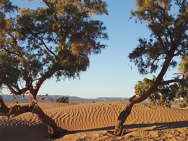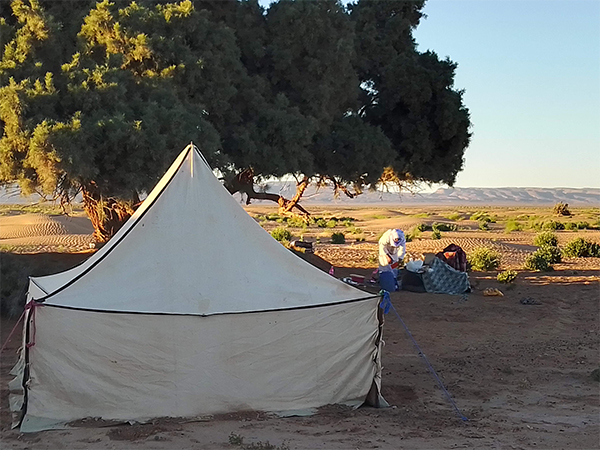 Avant votre réveil, les dromadaires sont nourris et mis en liberté surveillée ; le feu est ravivé Le petit déjeuner prêt (thé, café, lait, orange pressée, fromage, pain, huile d’olive, confiture de dates, fruits….) . La caravane s’ébranle ensuite en direction des grandes dunes de Zahar. Environ 3 heures trente de marche avant la pause the/déjeuner (plus ou moins14 km). Après un moment de détente, compter 45 minutes de montée pour atteindre le sommet et s’éblouir du coucher de soleil.